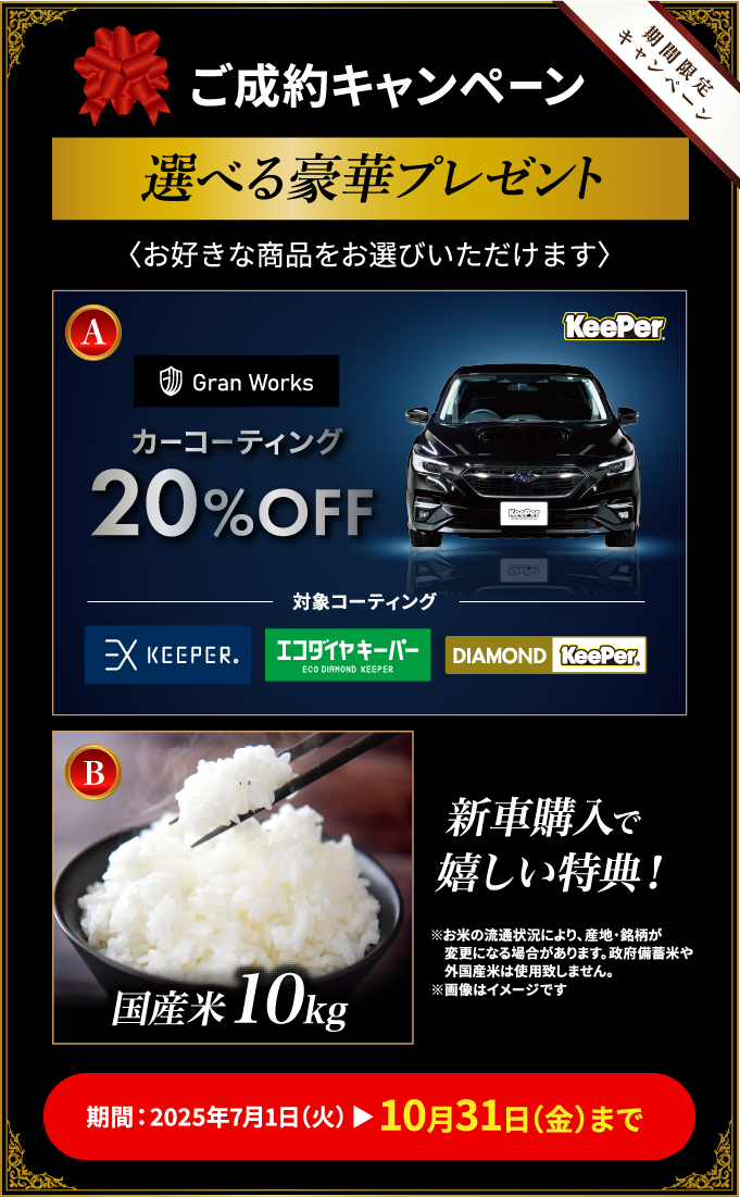 期間中に当社で新車をご成約いただいたお客様全員に、キーパーコーティング20%OFFまたはお米をプレゼント!